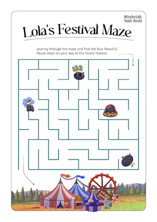 Lola’s festival maze is a visual tool that guides students through moments of emotional overwhelm or uncertainty. As they journey though the maze, they encounter turning points where they can pause, breathe and choose their next step with intention.