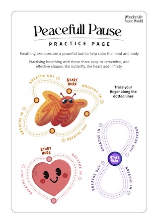 This activity features a dotted line path that children can trace with their finger while practicing slow, intentional breathing. A simple yet effective way to slow down racing thoughts, reconnect with the body, create space between feeling and reacting and build emotional resilience.